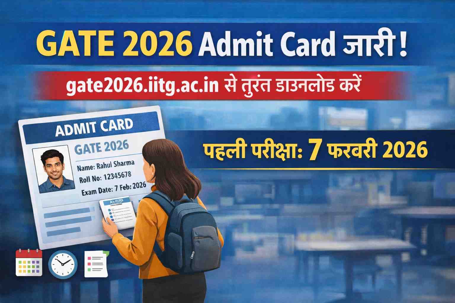 GATE 2026 की तैयारी कर रहे लाखों उम्मीदवारों के लिए बड़ी खबर सामने आ चुकी है। भारतीय प्रौद्योगिकी संस्थान (IIT) गुवाहाटी ने आखिरकार GATE 2026 का एडमिट कार्ड जारी कर दिया है। अब सभी पंजीकृत उम्मीदवार आधिकारिक वेबसाइट gate2026.iitg.ac.in पर लॉगिन करके अपना Hall Ticket डाउनलोड कर सकते हैं। यह एडमिट कार्ड उम्मीदवार की परीक्षा में भागीदारी का सबसे महत्वपूर्ण दस्तावेज है, जिसके बिना परीक्षा केंद्र में प्रवेश संभव नहीं होगा।
